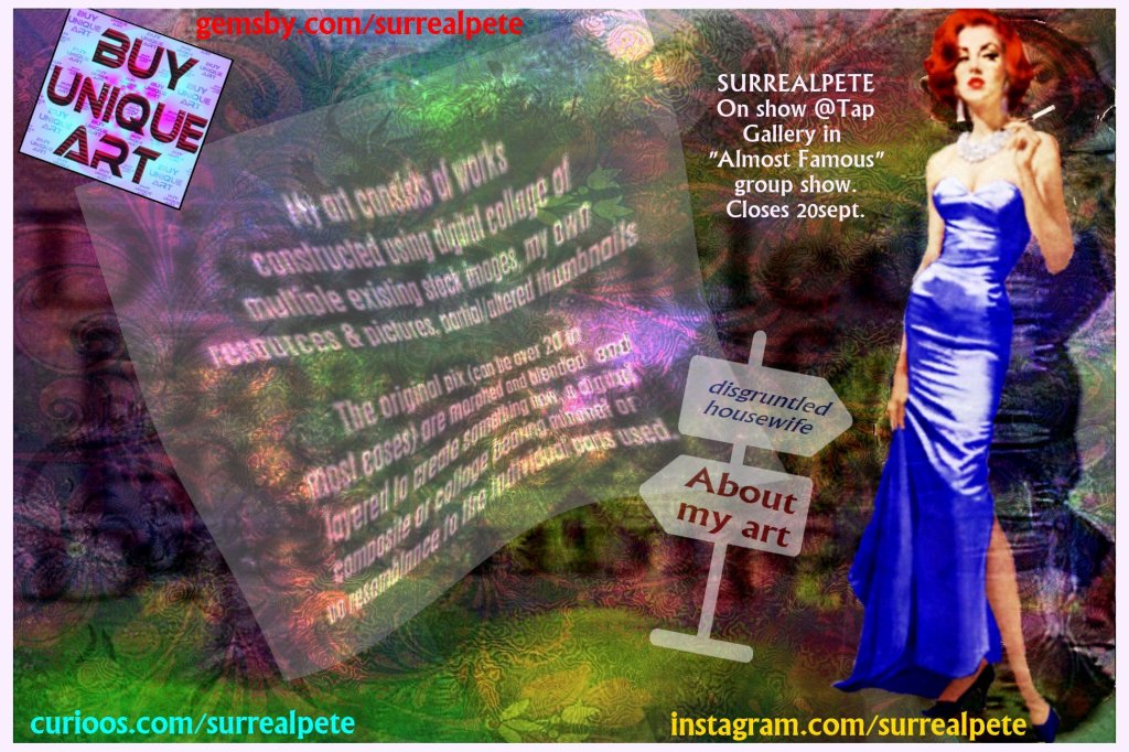Show extended till 20sept!! LAST WEEK TO SEE THIS SHOW AT TAP GALLERY SYDNEY ends on 20sept 2020 More wall art at Curioos Open till 20sept!!! If you like it, Share it:PocketTweetShare on Tumblr Click to email a link to a friend (Opens in new window) Email Click to share on WhatsApp (Opens in new window) WhatsApp More Click to share on Reddit (Opens in new window) Reddit Click to share on Telegram (Opens in new window) Telegram Click to print (Opens in new window) Print Like Loading... Related Published by surrealpete digital collage artist working in sydney wallart on metal & glass wearable art scarves & art jewels many art gifts and homewares View all posts by surrealpete